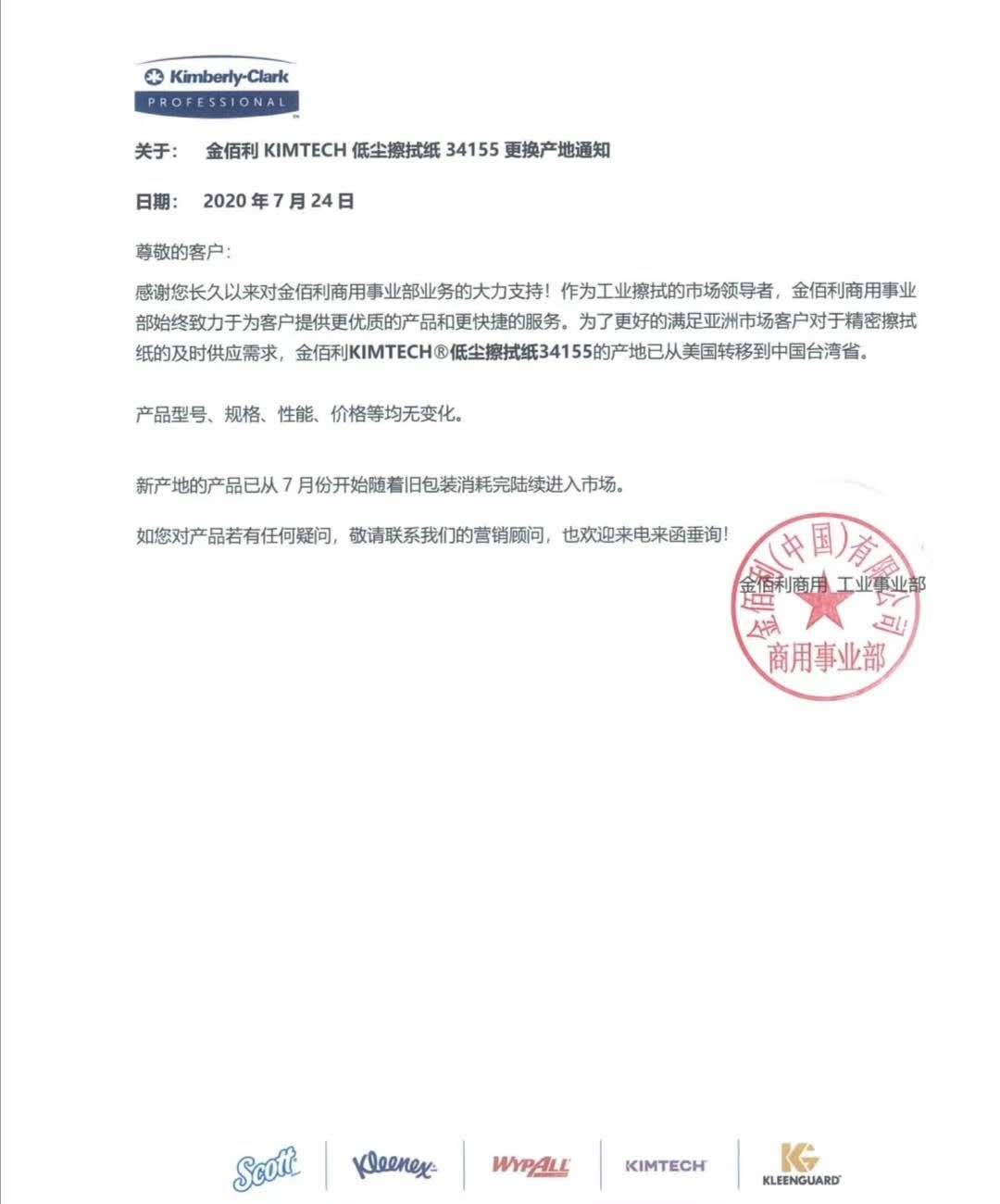 作为金佰利的明星产品“小绿盒”—金佰利低尘擦拭纸34155自2020年7月24号开始更换产品。由原来的美国产变更为台湾产。产品型号、规格、性能、价格均无变化。外包装有几个具体变化,客户拿到产品注意观察!