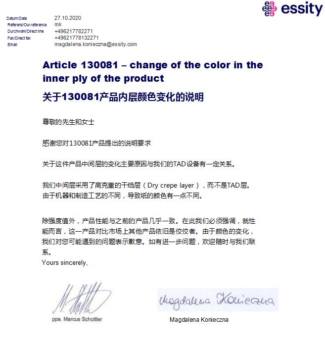 我们中间层采用了高克重的干邹层,而不是TAD层。由于机器和制工艺的不同,导致纸的颜色有一点不同。
