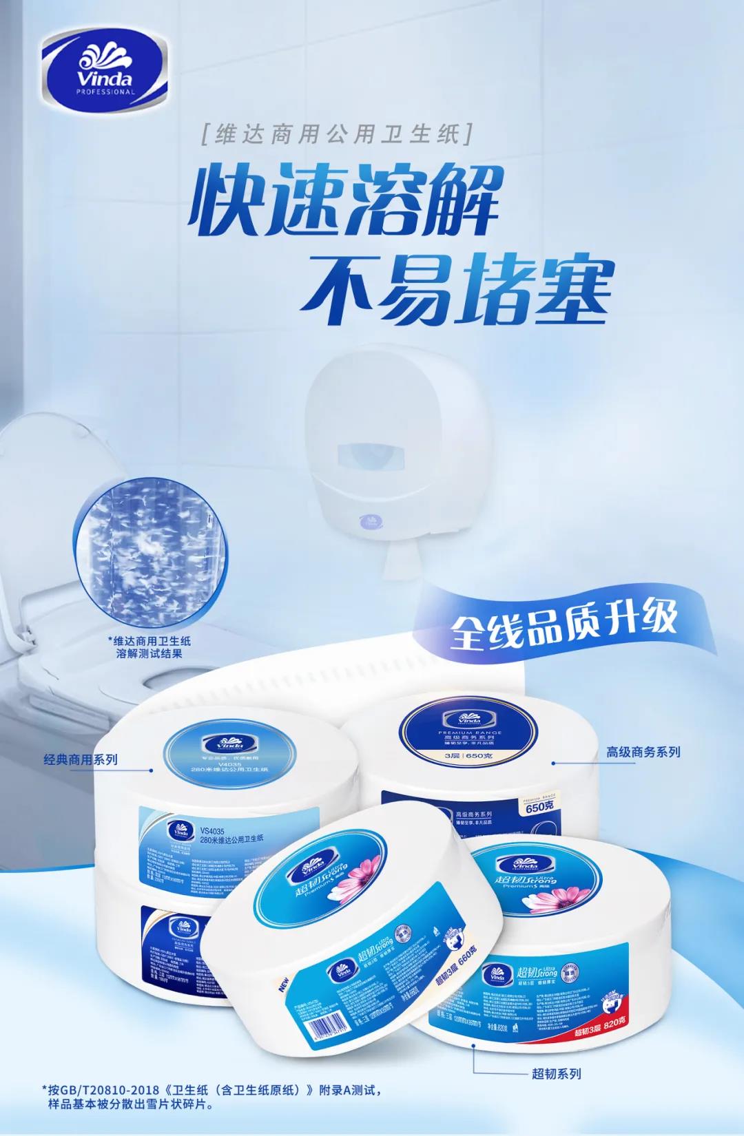 A: 选用易溶不易堵塞的卫生纸,遇水后很快溶解,并不会造成马桶的堵塞,同时选用可溶性的厕纸,保证了卫生间的 卫生安全,防止厕纸污染。